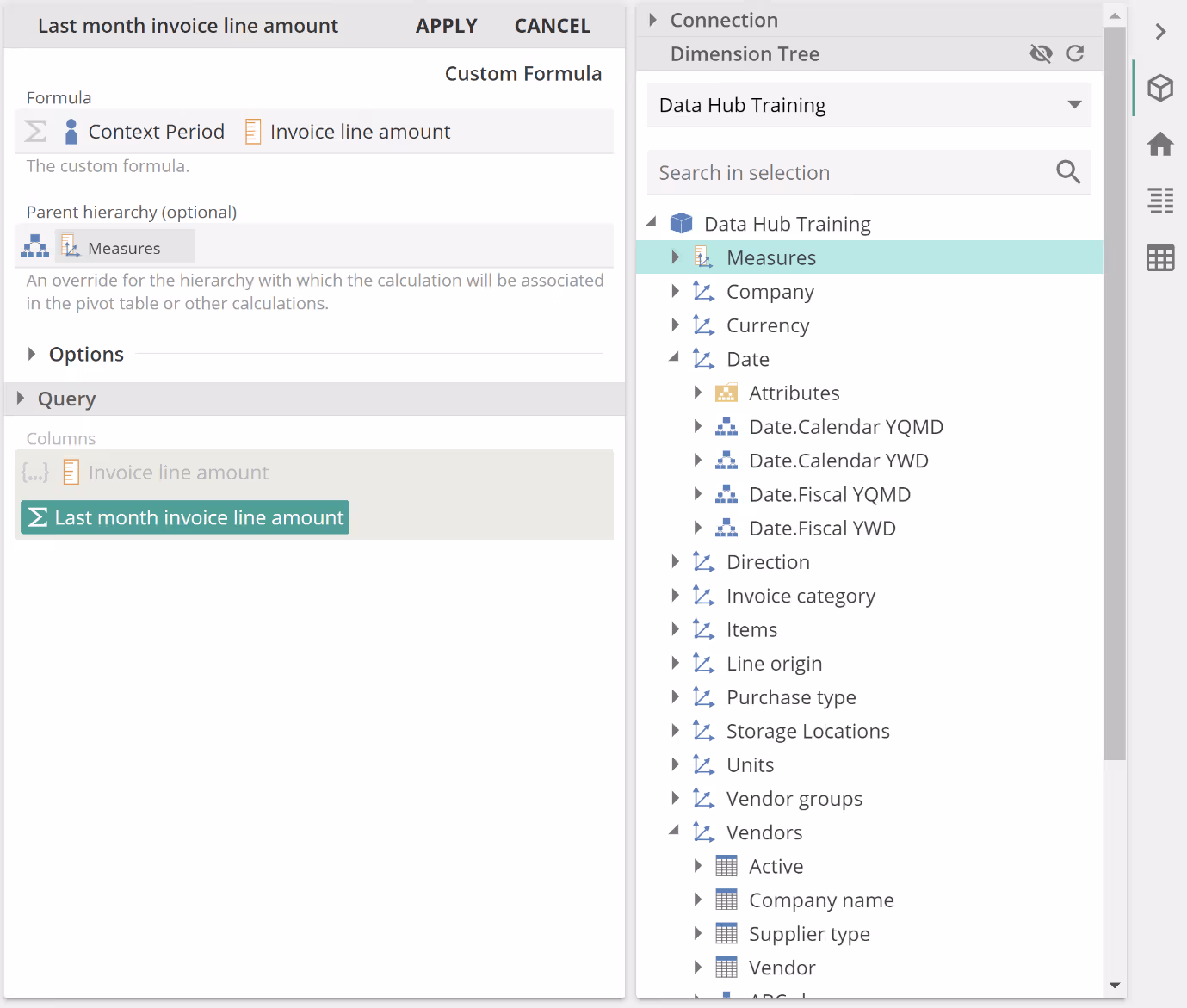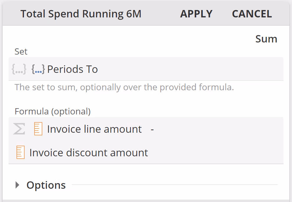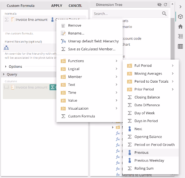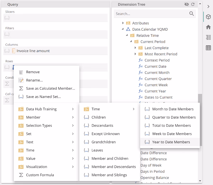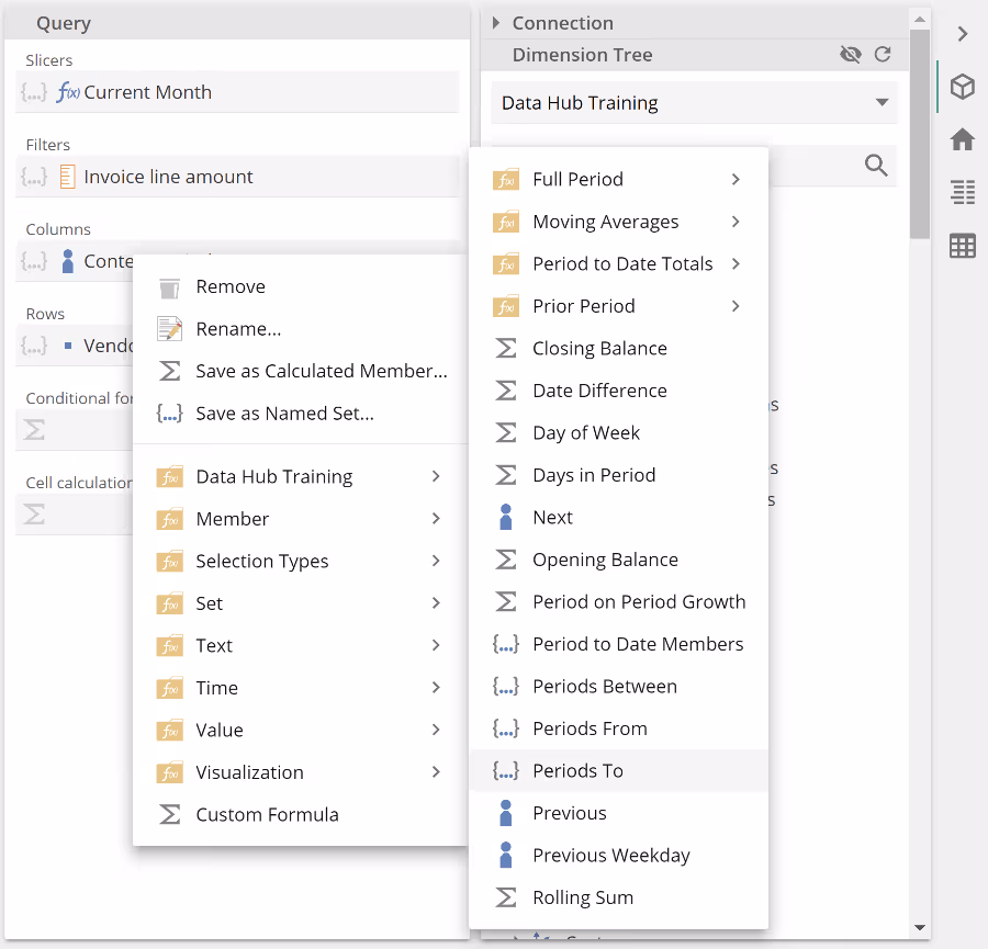 Our solution was to place the Context Period Function in a Custom Formula, and we emphasized the importance of the Invoice line amount being first in the Formula placeholder so that the Custom Formula would be treated as a measure.