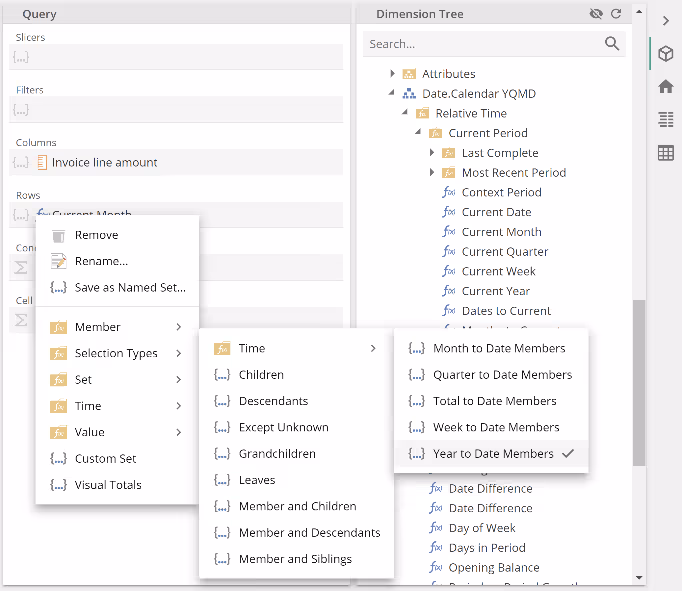 Please do note to the Invoice line amount measure is now on Columns. Now show the placeholder tab menu for Current Month and select Year to Date Members as in the following image.