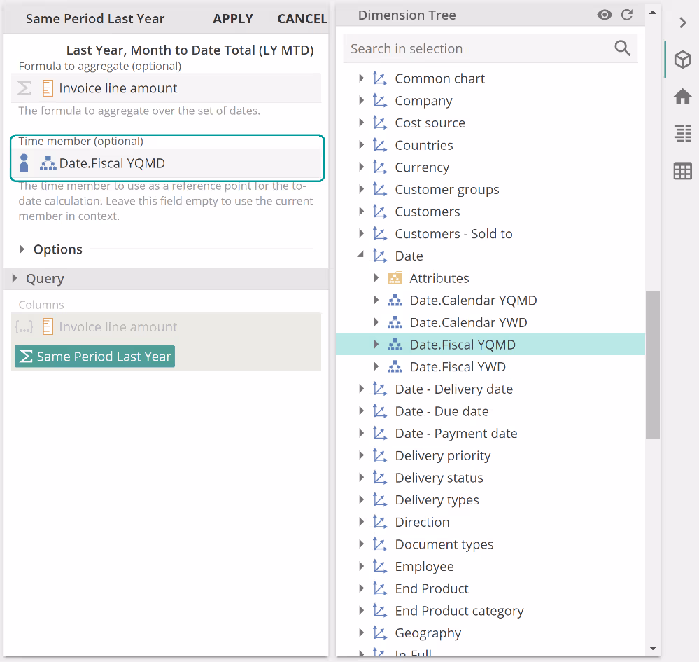 This should emphasize just how flexible Time functions are. But what if a report makes use of two Date hierarchies? For example, a report may make use of an Invoice Date and a Shipped Date hierarchy. In such a case, it is possible to restrict a Time Member placeholder only to accept time context from a given hierarchy. This is achieved by populating a Time Member placeholder with a hierarchy. In the following image, we've elected to restrict the Same Period Last Year time context to the Date.Fiscal YQMD, presumably because we will make use of another Date hierarchy as we built out the query design.