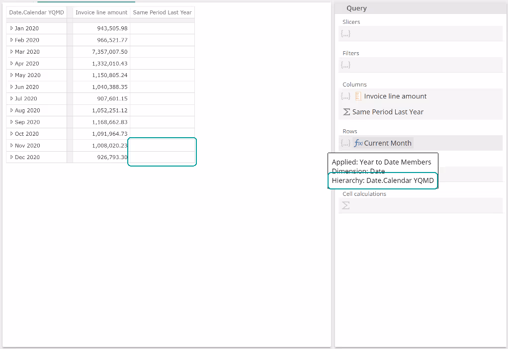 However, with this restriction in place and with the Date.Calendar YQMD month members on rows, the Same Period Last Year cells are no longer able to determine time context.