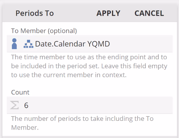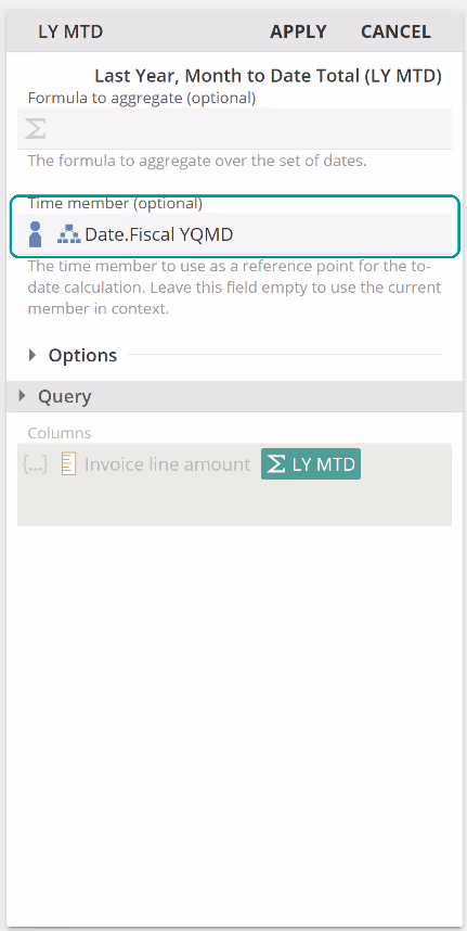 Recall you can hover over any Function for a description. We've not elected to do so in this image, as the tooltip would have overlaid the menu. The name of the Function gives us a reasonable understanding of what it will do, and do note the Sigma (Σ), which indicates it is a Value Function. So we would expect this Function will, using its Time Member field as the reference point, return the same period in the last (previous) year, and then with this period, perform a month-to-date total for a given formula. That's a little to take on, but our table has months on rows (not dates). So we can simplify the previous statement for our scenario to using its Time Member field as the reference point, the function will return the same month in the last (previous) year, and for a formula.
