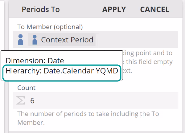 - Selection Type – for example, for Year to Date Members applied to the Context Period Function