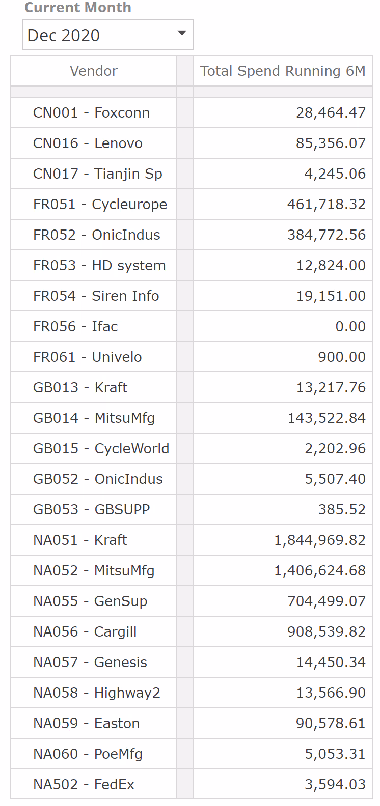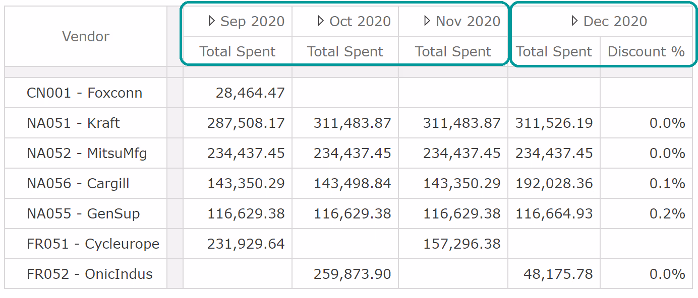Click Apply, and each value is now the sum of the provided Formula for the six months to Dec 2020, for the given vendor. This is shown in the following.