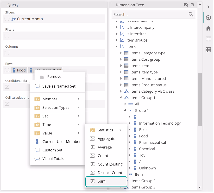 The Sum function is particularly useful for ad-hoc categorization (for example, summing a set of item types or regions). Be aware that Ctrl-clicking and Shift-clicking allow multiple tab selections within a placeholder, in the same way, they allow multiple-member selection from the Dimension Tree. The following trivialized example shows the Food and Pharmaceutical tabs both selected (evident by the darker shade). Right-clicking either tab will now show all functions with a Set primary placeholder. As discussed, the Sum Function has a Set type primary placeholder and so shows in the placeholder tab menu as in the following.
