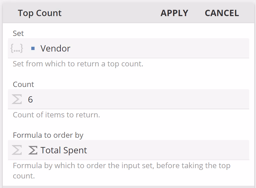 We've looked at two common Value Functions. The remaining Functions we'll address are Set Functions. We've already seen the Top Count Function, and the fields for this Function are shown in the following image.
