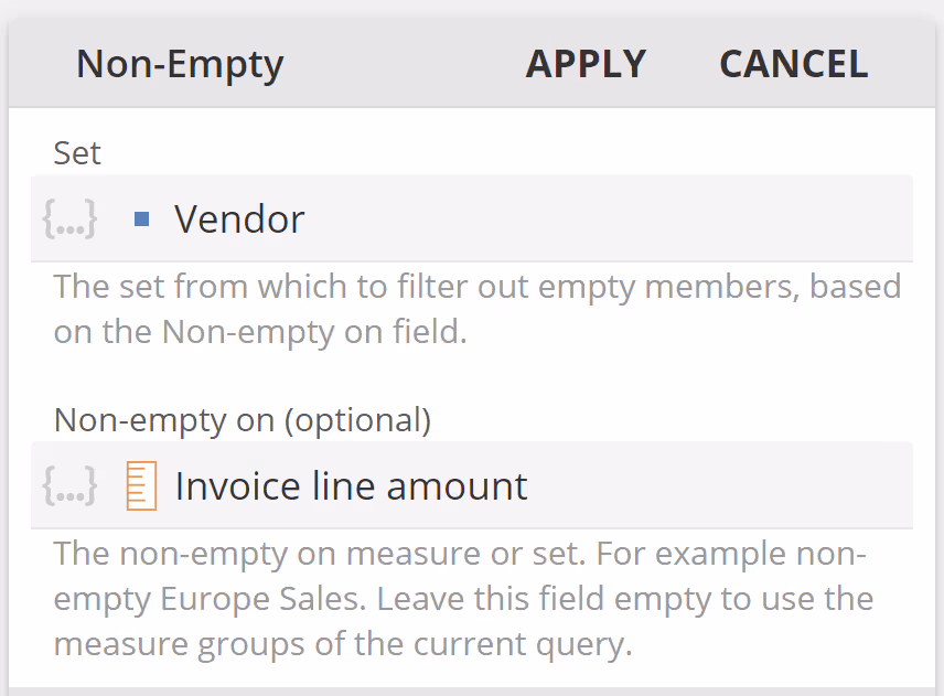 Now, if we want to show only those rows with Invoice line amounts, we will not be able to make use of the tables built-in Filter Empty Rows option (from the Data design panel). Instead, we can wrap Vendors in the Non-Empty Function in order to have this Function return only the vendors that are non-empty for the Invoice line amount Measure.