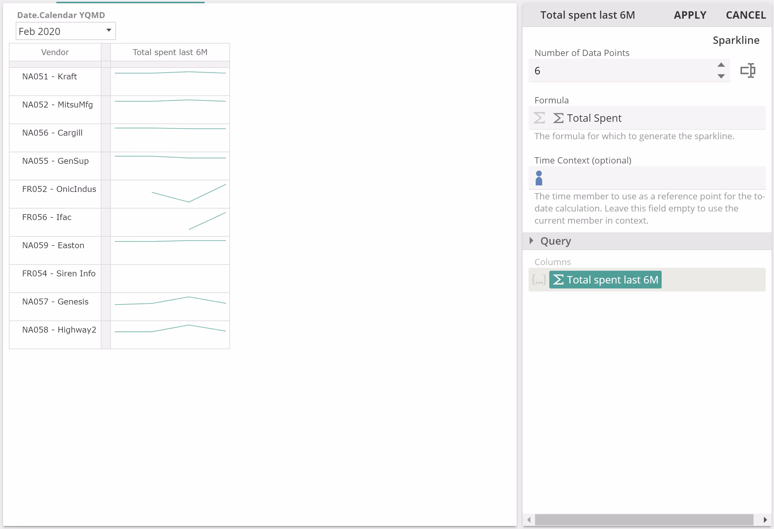 The application provides two Visualization Functions, Sparkline and Status. Visualization Functions "wrap" as we have seen previously with Value Functions. Strictly, speaking Visualization Functions are Value Functions where the value they return is the visualization for the cell. With that in mind, you should find you have all the knowledge required to make use of Visualization Functions. The following image provides a quick example of making use of the Total Spent calculation and Vendors on Rows, as in many of our previous use cases.