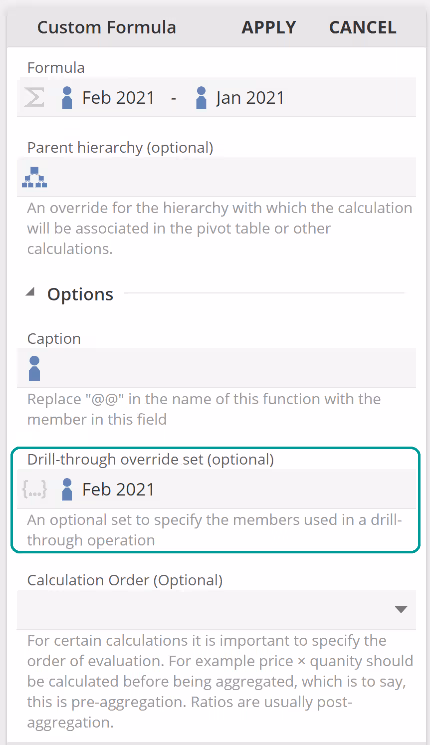 Let's assume the designer has decided that drill-through should provide only the Feb 2021 records on the basis that the focus of the formula Feb 2021's growth compared to Jan 2021. This is a simple matter of dragging the Feb 2021 member from the Dimension tree to the Drillthrough override set placeholder, as in the following image.