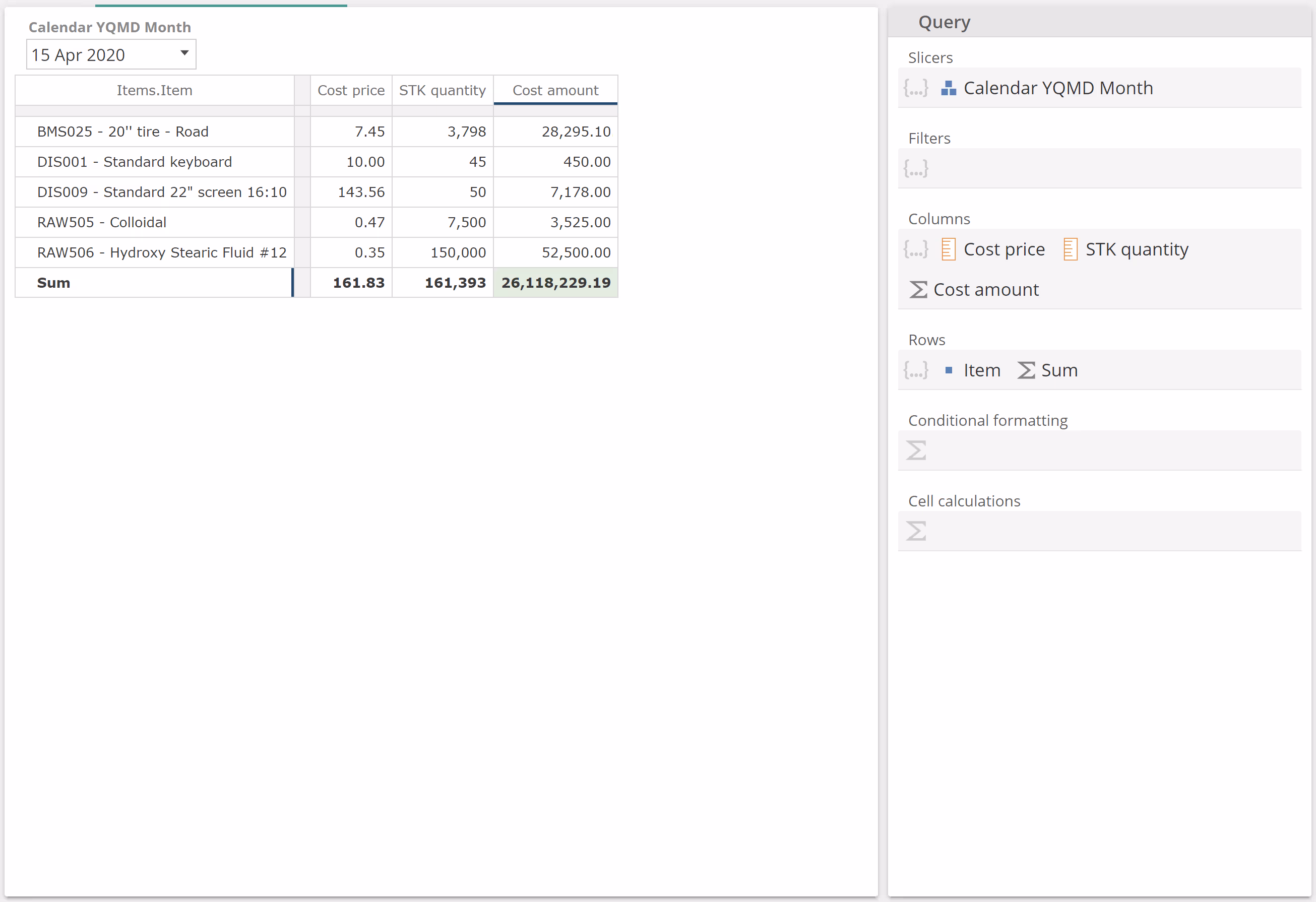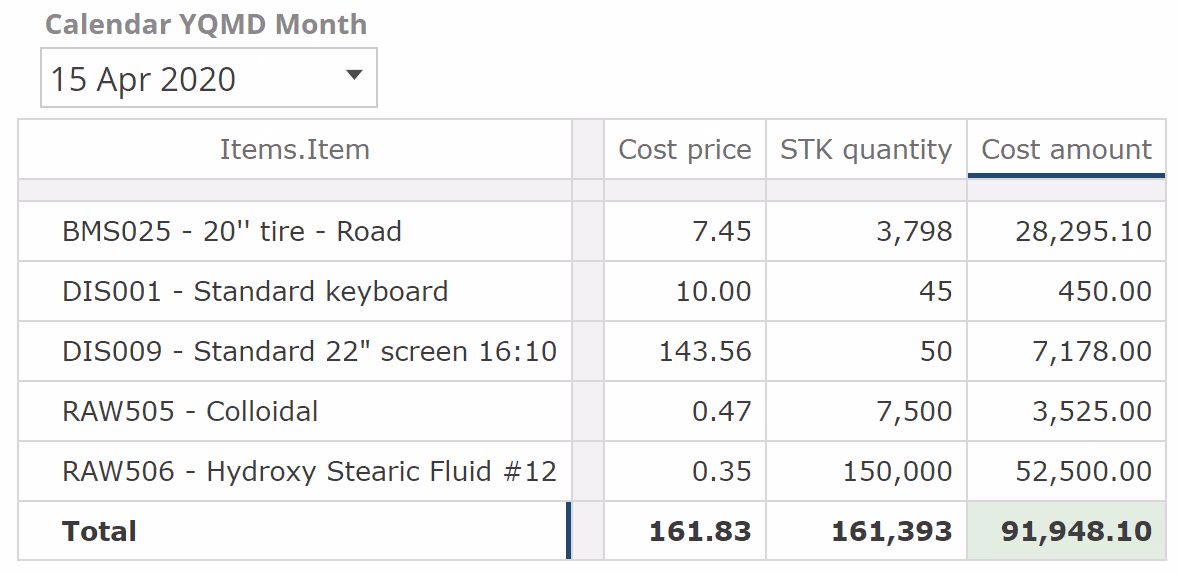 In the above image, we have two formulas Cost amount (defined as Cost price x STK quantity) and Sum (of the Item level). Everything is rosy, except for the cell where these two formulas intersect. It should be relatively obvious that the Cost amount column does not sum to the bottom-right cell. Instead, the value we are seeing is the product of the sum-of-costs and the sum-of-quantities (161.83 x 161,393).