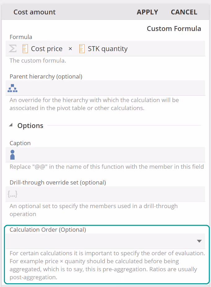 Stating it in this way, we might say the bottom-right cell Cost amount formula has been evaluated post-aggregation. And from this, we can see that in order to correct the formula, we want to ensure it is evaluated pre-aggregation. Again, to be clear, it is the Cost amount formula that should be evaluated pre-aggregation, so we turn we must set the Cost amount's Calculation Order.