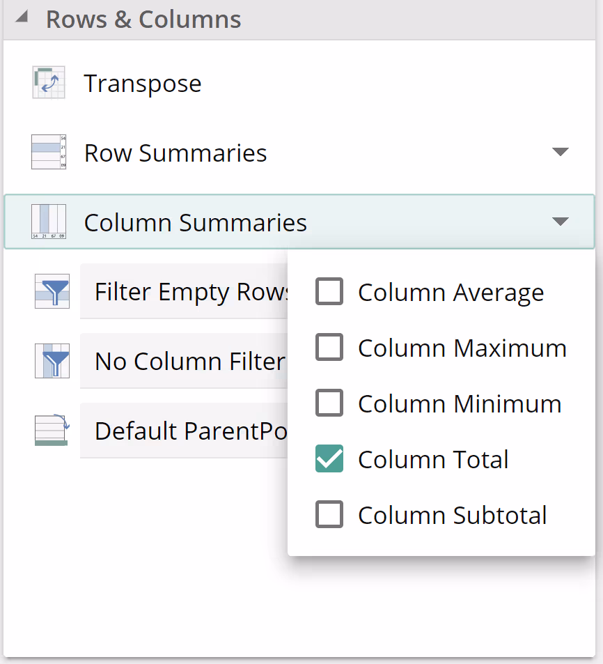 This example made use of the Sum function to provide a column total. Importantly the table's built-in Summaries are also formulas and may result in formula intersections. If we remove the Sum Function (right-click Remove from the placeholder tab menu), we can get the same result by applying Column Total.