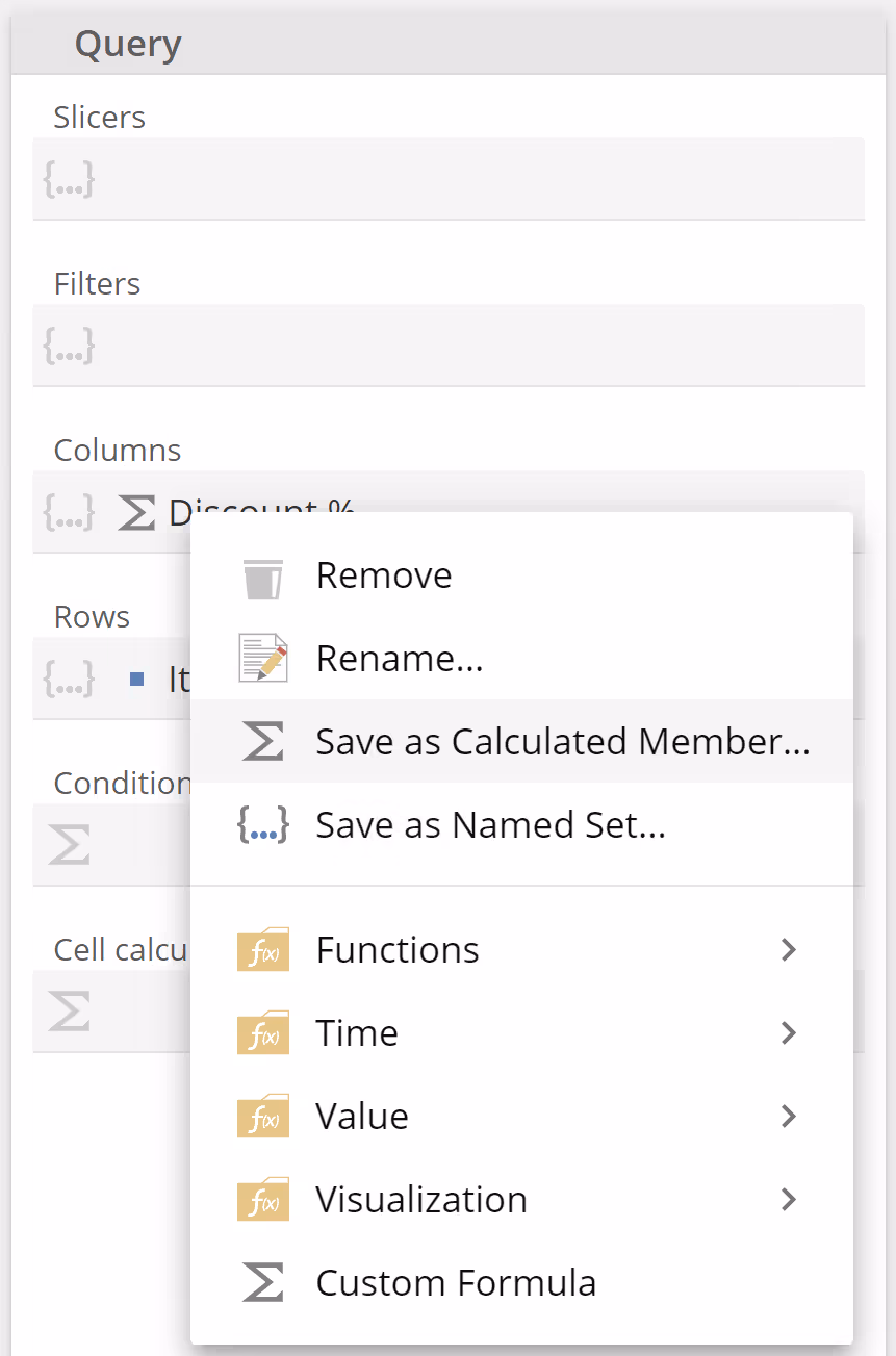 It is common to find a formula that you wish to use across multiple analytics. For example, let's take the **Discount %**we defined previously. If you right-click, the placeholder tab menu will show and provide the option to Save as Calculated Member, as in the following image.