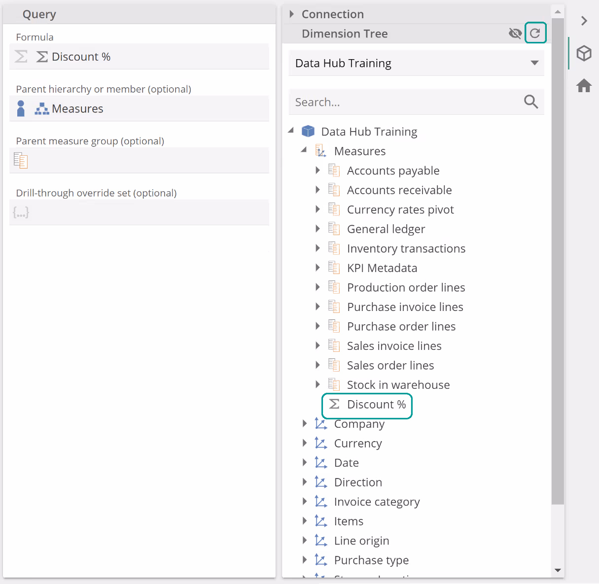 There are two ways to use a Calculated Member resource. You can drag it from the Resource Explorer into the relevant query placeholder. Alternatively, if you specify a Group-by hierarchy or parent member, you will find a newly-created Calculated Member on the Dimension Tree. In this case, given we would like to treat Discount % as a measure (and group it with other measures), drag Measures from the Dimension Tree to populate the Group-by hierarchy or parent member placeholder, as in the following.