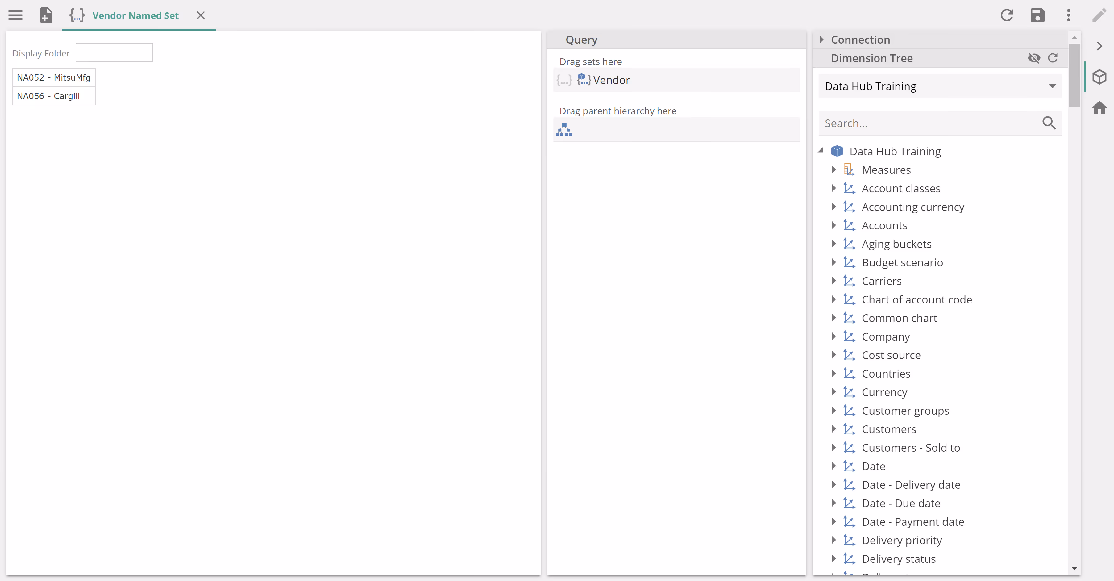 Named Sets work similarly to Calculated Members. To show the Save as Named Set option in the placeholder tab menu, ensure a set tab is selected or ensure multiple items are selected (using Ctrl-click and Shift-click). From an earlier example, we've Shift-clicked to select both the NA051 and Vendor tabs in the following image.