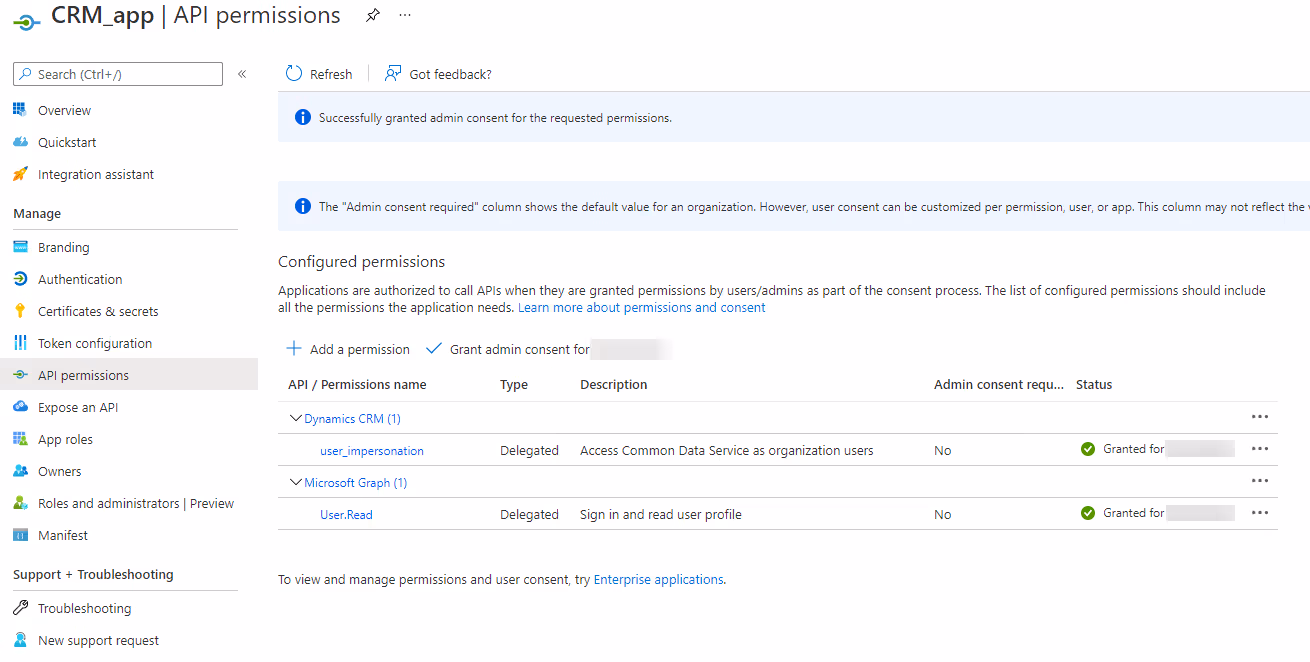 On the API Permissions node of the App, add Dynamics CRM permission user_impersonation and Grant Admin Consent to allow users connecting through the app