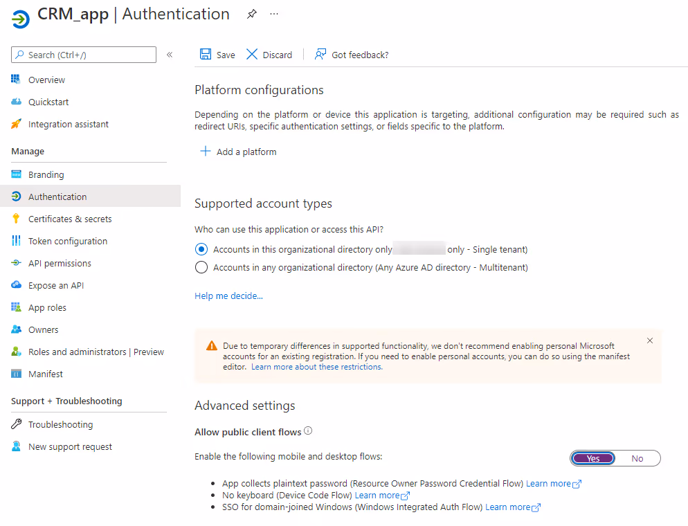 To connect to D365 Sales using service credentials, you require a new application registration in the Azure directory.