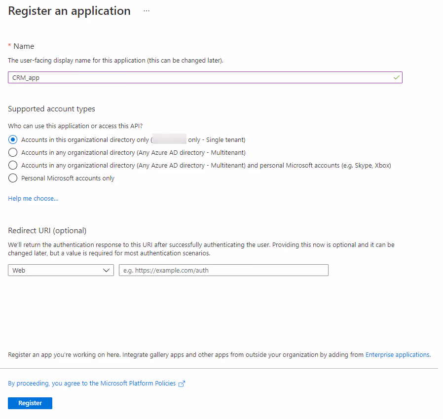 To connect to D365 Sales, a new application registration needs to be created in the Azure directory.