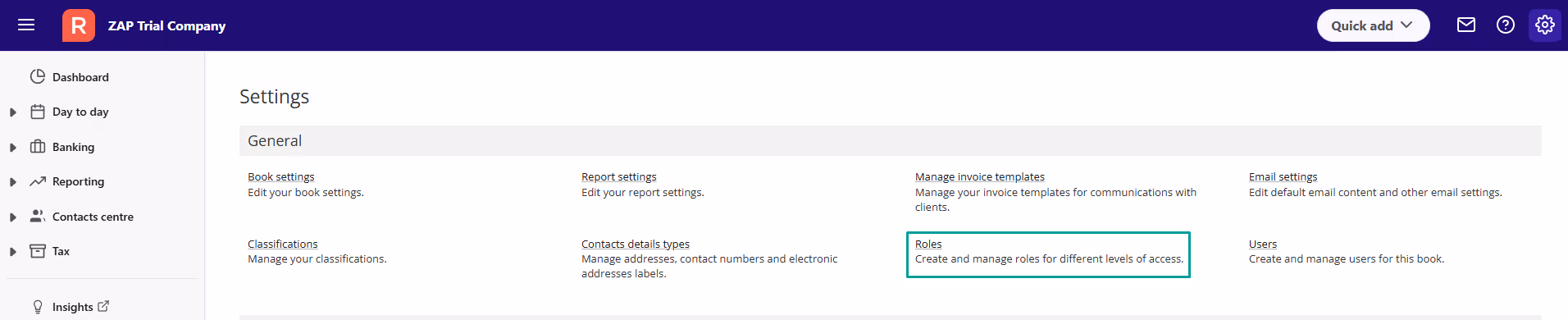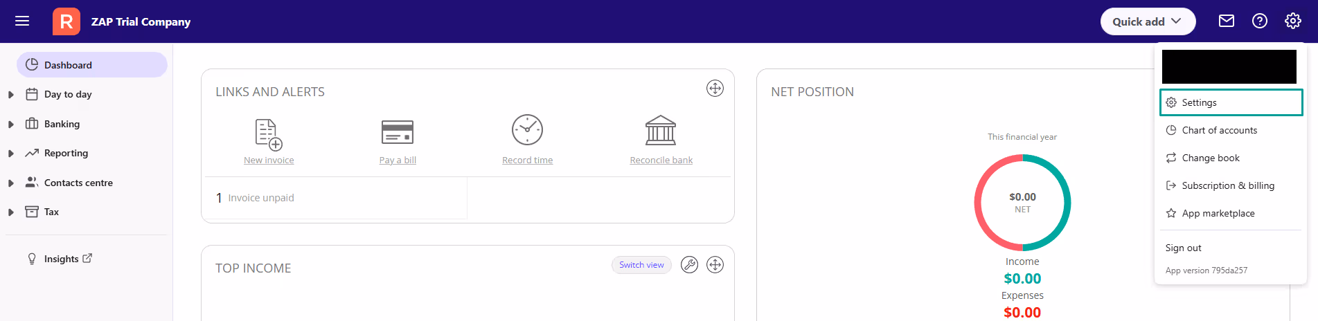 Log into your Reckon One Book and go to Administration (circular cogwheel icon) menu in the top right and go to Settings.
