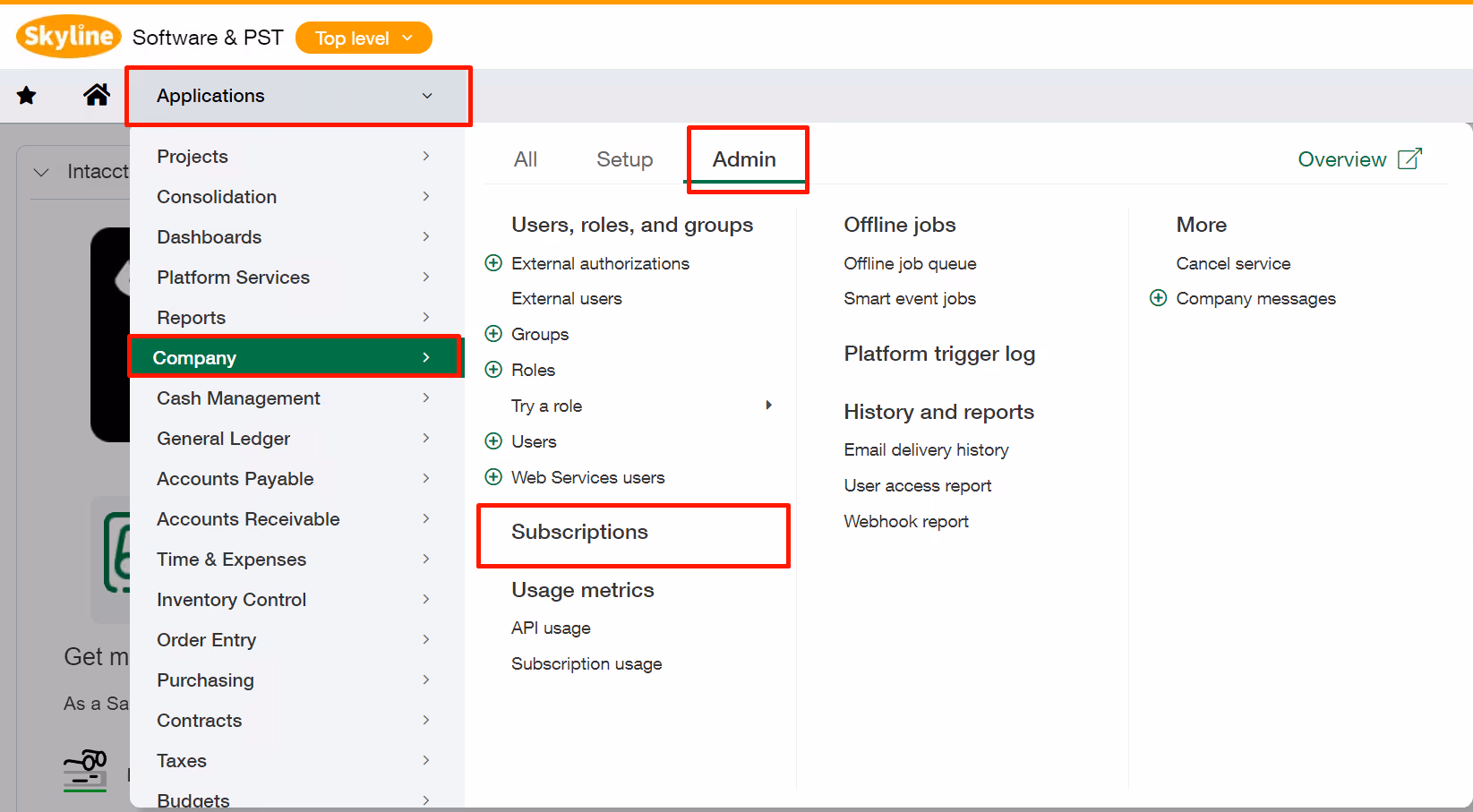 From the menu, navigate to Applications -->> Company -->> Admin -->> Subscriptions