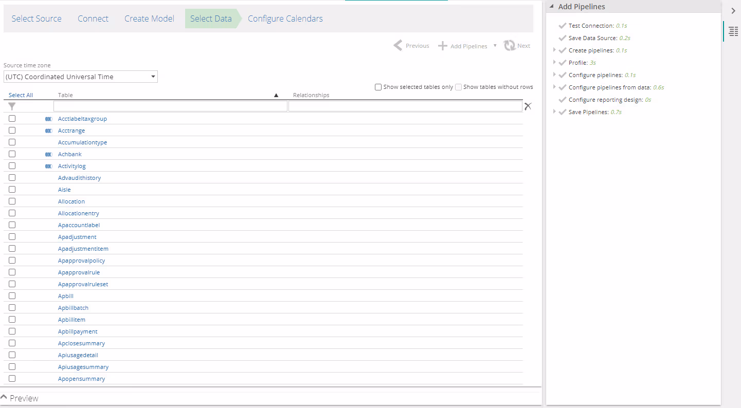 noteIf all of the tables in the data source are selected, the pipeline will always perform a union on all tables from the data source, even if the table list changes. For example, if the data source contains only tables of sales for USA, UK, and Europe, selecting them all will union the three tables into a single pipeline. If a fourth table with sales for Australia is later added, it will automatically be included in the union for the pipeline.