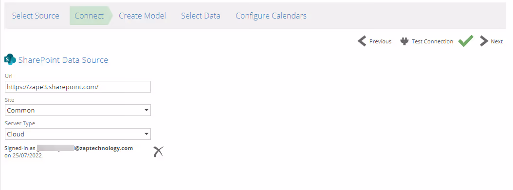 - From the source type pop-up, click Connectt on the SharePoint entry tagged Data Source.