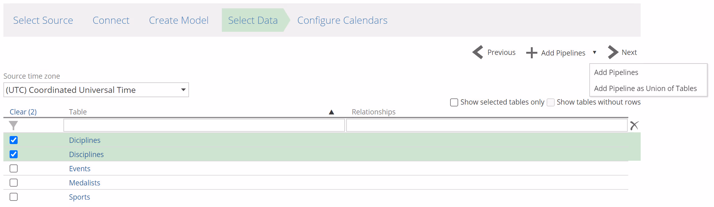 Use the Add Pipeline as Union of Tables option from the Add Pipelines drop-down menu, to add a single pipeline created from a union of the selected tables.