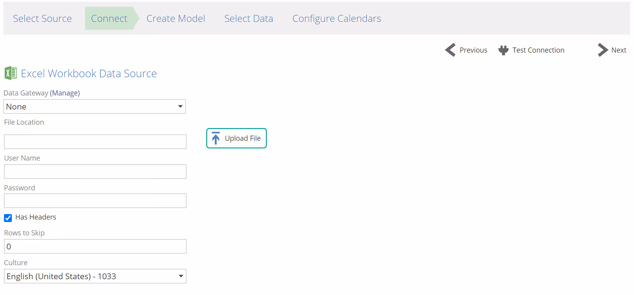 - Leave Data Gateway drop-down item as None unless connecting to an on-premise data source.