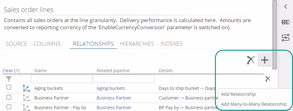 Navigate to the pipeline from where you want to define a new relationship, e.g. Sales Order Lines, and click + Add Relationship