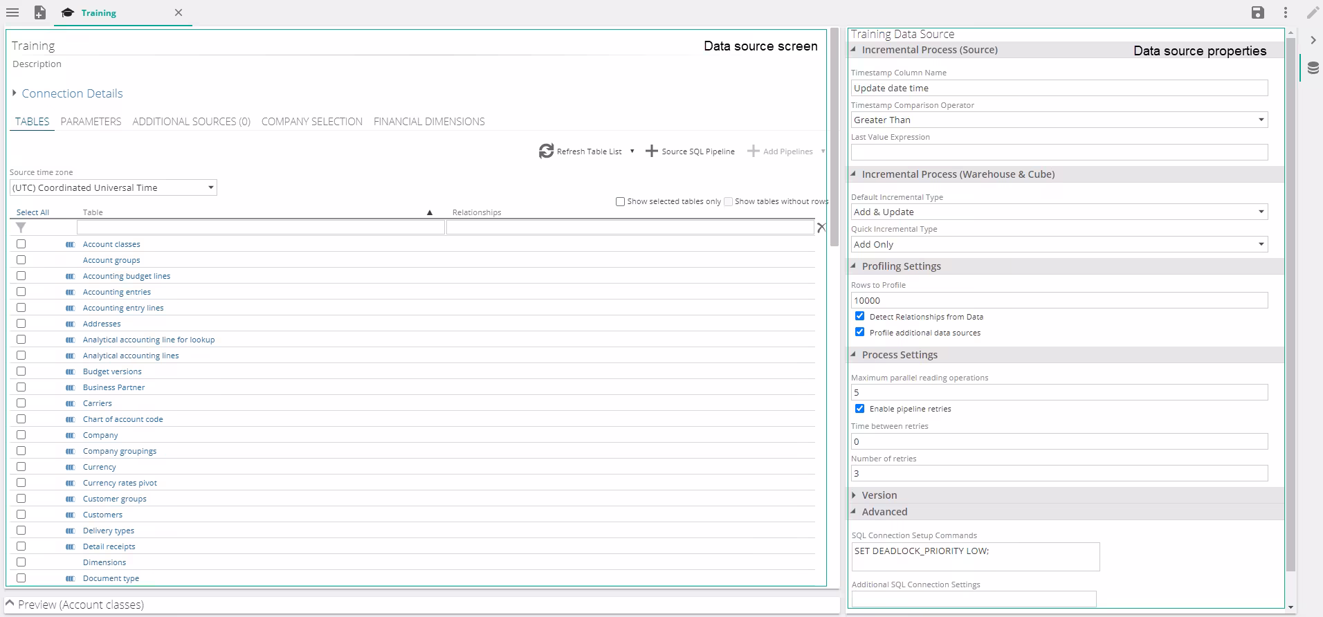 In the one data source there are multiple tables with the same schema, but different names — typically one for each company (named CompanyName.Tablename). You can union tables from different companies to have a single combined pipeline in the data warehouse. As the company tables have different names, you must manually add the appropriate tables to the pipeline.
