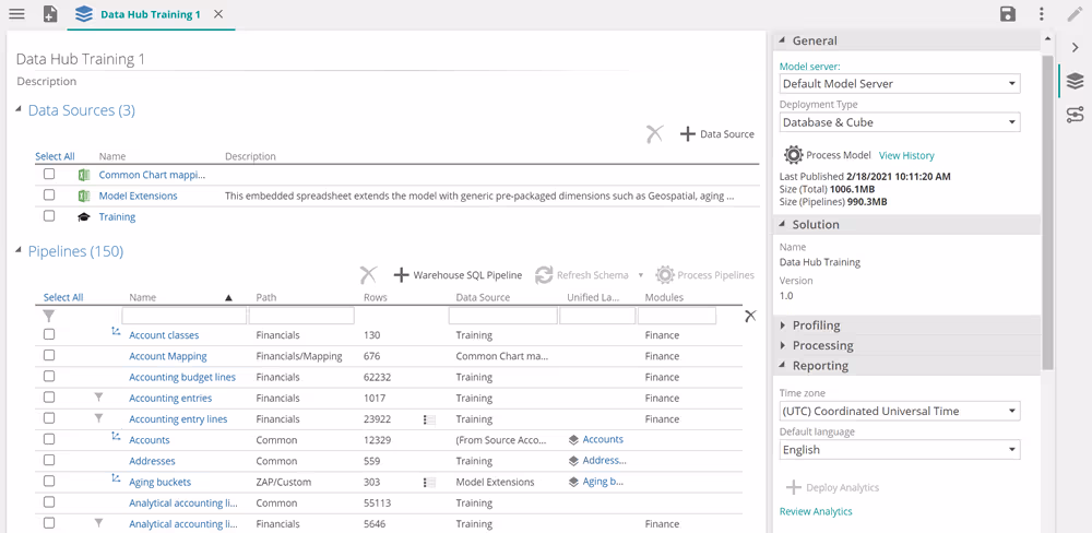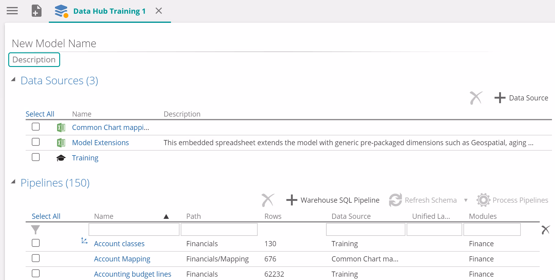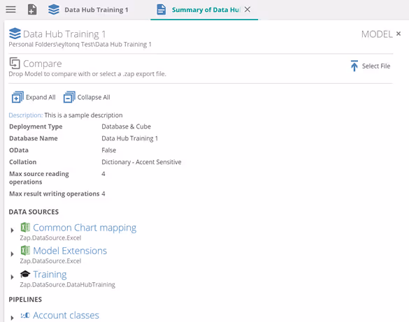 - The left side of the tab lists individual model sections (e.g. data sources and pipelines).