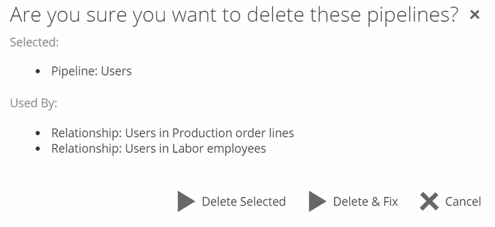 When removing resources (pipelines and data sources) from a model, a verification dialog box appears, allowing you to verify the deleting action. Removing a resource with dependent resources (subresources) will show the the deletion verification, which allows you to determine what to delete.