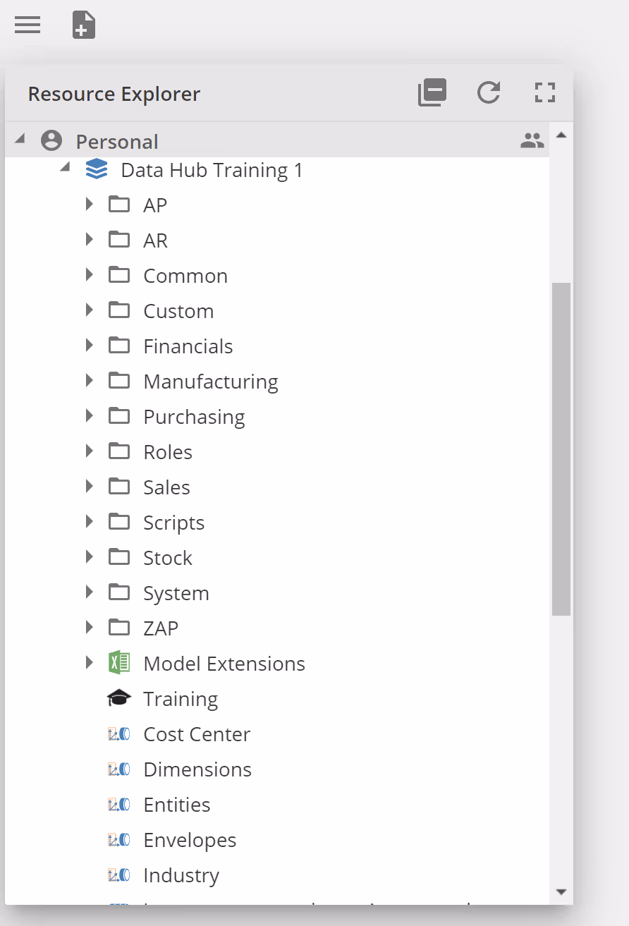 Data model nodes, displayed in the Resource Explorer, contain all the sub-resources of a data model, such as pipelines and data sources. In this regard, they behave similarly to folders in the Data Hub interface.
