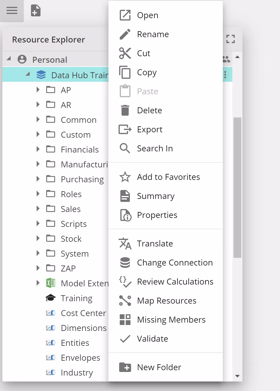 Although designed for use with data model nodes, relevant right-click options are available with all other folders and resources in Resource Explorer.
