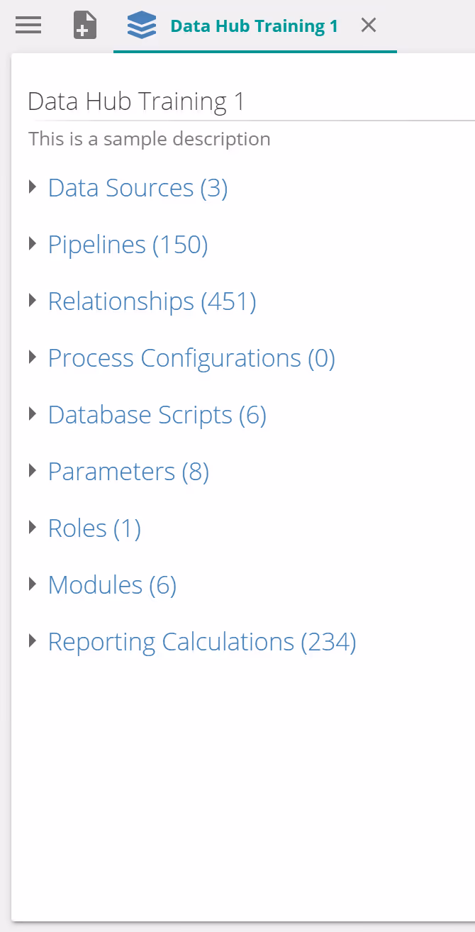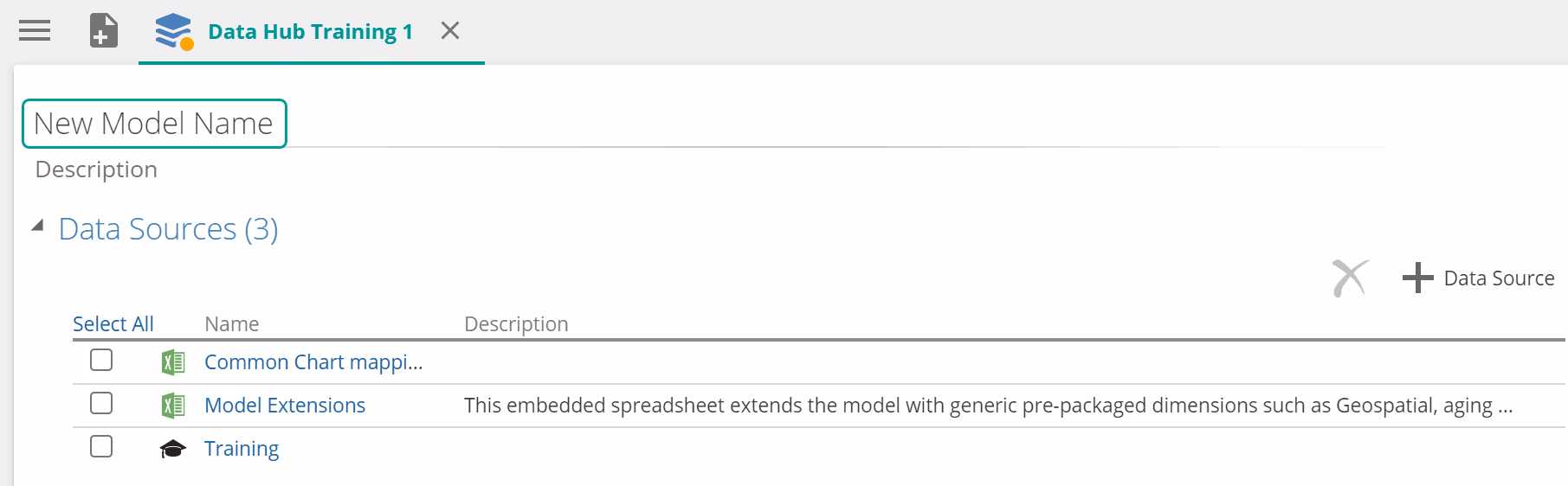 Right-click options provide the ability to create sub-folders and move sub-resources within data models. Data model nodes hold all the sub-resources of a data model (e.g. pipelines and data sources). They behave similarly to folders in this regard. For large data models, it is useful to create a more complex structure by adding sub-folders for different sub-resource types, or for different divisions of the organization, then move the data model's sub-resources to the sub-folders. This can be seen in the Training Model below.