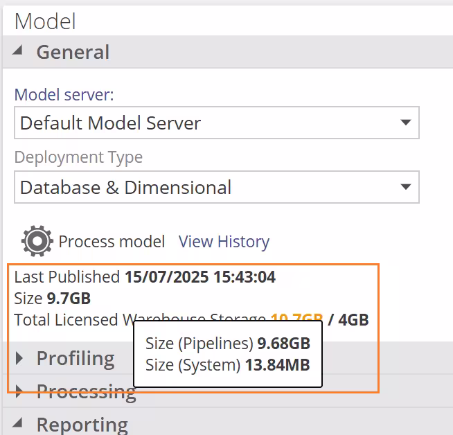 - When the model's warehouse is Provisioned Azure SQL Server, there will be a Size (Reserved) item, which is the actual storage space used by the model. You may be able to reclaim some of this space by performing warehouse maintenance.