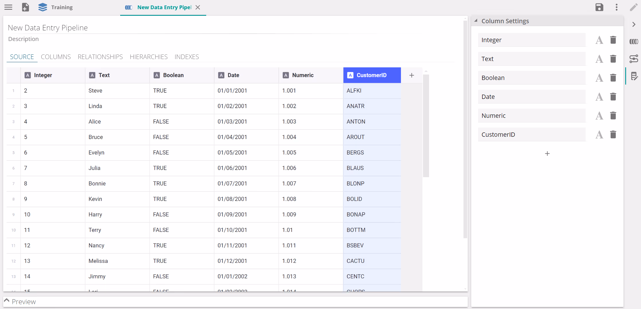 Data entry pipelines give users the ability to create pipelines where they can insert and interact with data manually. Data is added manually by typing or copying and pasting.