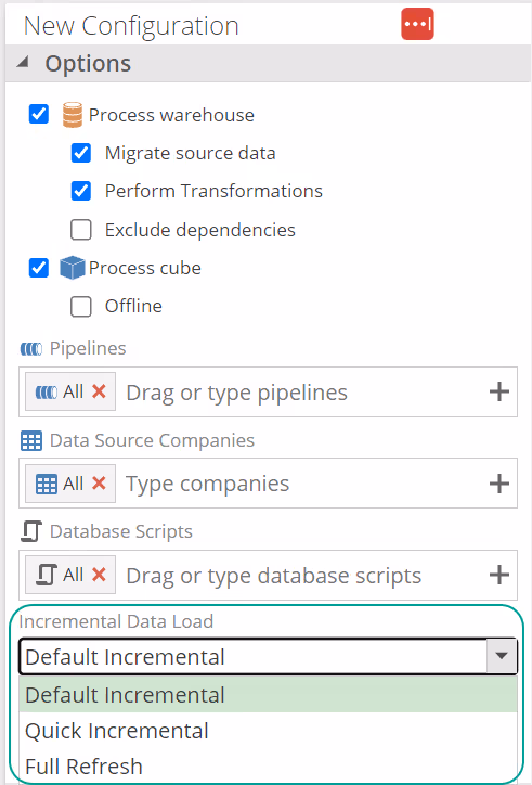 Default process type and Quick process type drop-down lists allow you to specify the pipeline-level behavior for the two available types of incremental loading. The following options are available from each drop-down list: