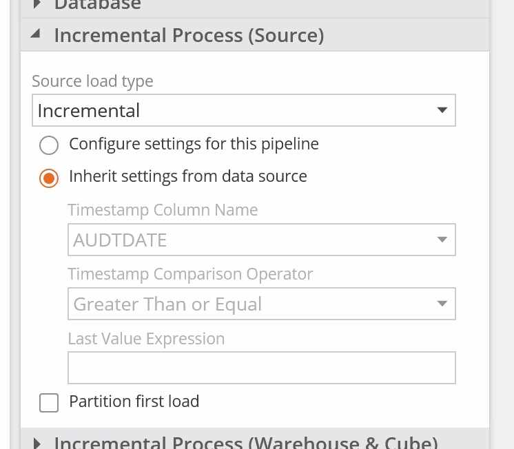- Must have Source load type configured as Incremental, One time, or Partitioned.