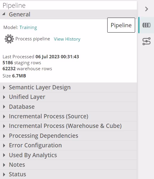 You can view processing dependencies for the current pipeline by examining the new Processing Dependencies area of the pipeline Properties Design Panel. A pipeline depends on another pipeline if there's a lookup, warehouse pipeline, calculation, or SQL step in the pipeline that references the other pipeline.