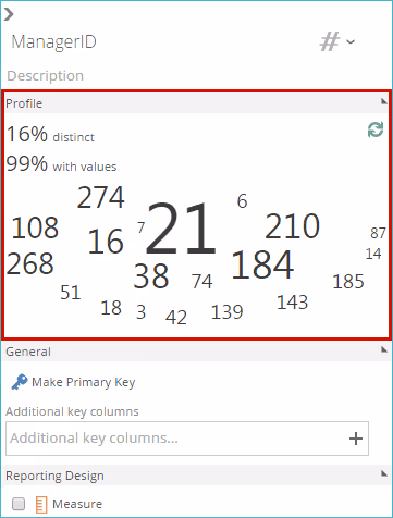 The granularity of each column. This information appears as the percentage of distinct values. This is important when deciding if a column should be an attribute or a member property.