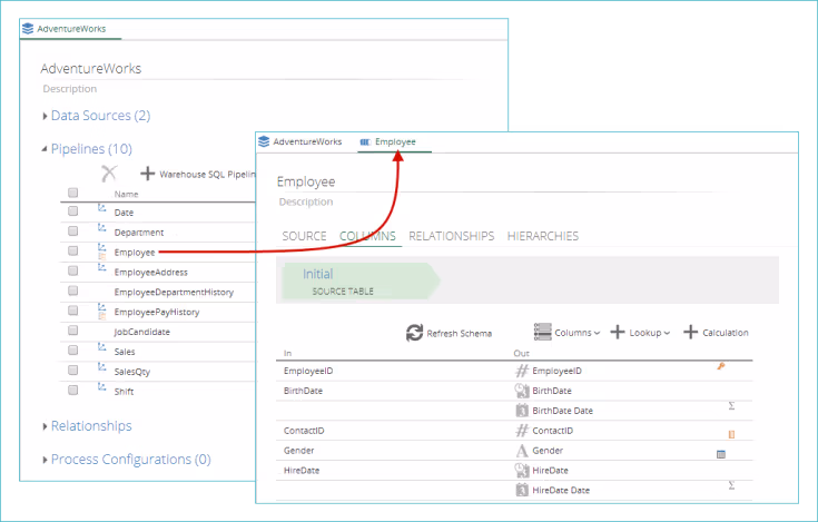 Pipelines are configurable resources that exist within models. They define a source, steps that transform the data, and a destination. Pipelines are where most model customization occurs and most of this configuration focuses on the pipeline's column list.