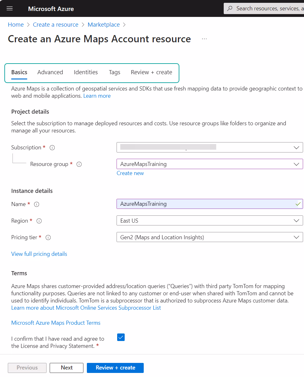Provide required information on the Basics tab. Remember to accept the terms. To use all default values for the service account, click Review + create. Should you wish to change any default values, step through the wizard and make the required changes.