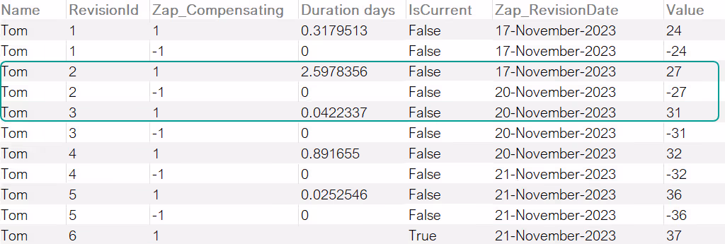If there is a change in history, as seen on 20 November, the last record on the 17th will be finalized (IsCurrent becomes false, and the active duration time is calculated). A compensating record is added to negate the tracked value in the previous record and a new "current" value is added.