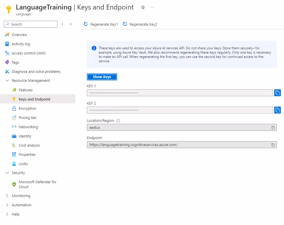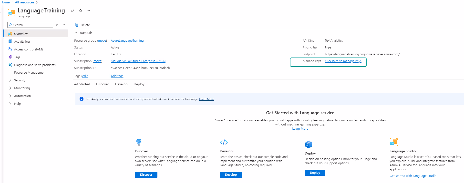 A deployment screen will appear, and once deployment is complete you can goto Manage Keys and copy and save your Key and Endpoint for authentication later in Data Hub.