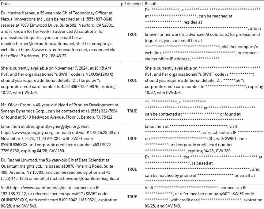 Personal Identifiable Information (PII) detection service hides information from the input data. All PII can be redacted, or just specific categories.