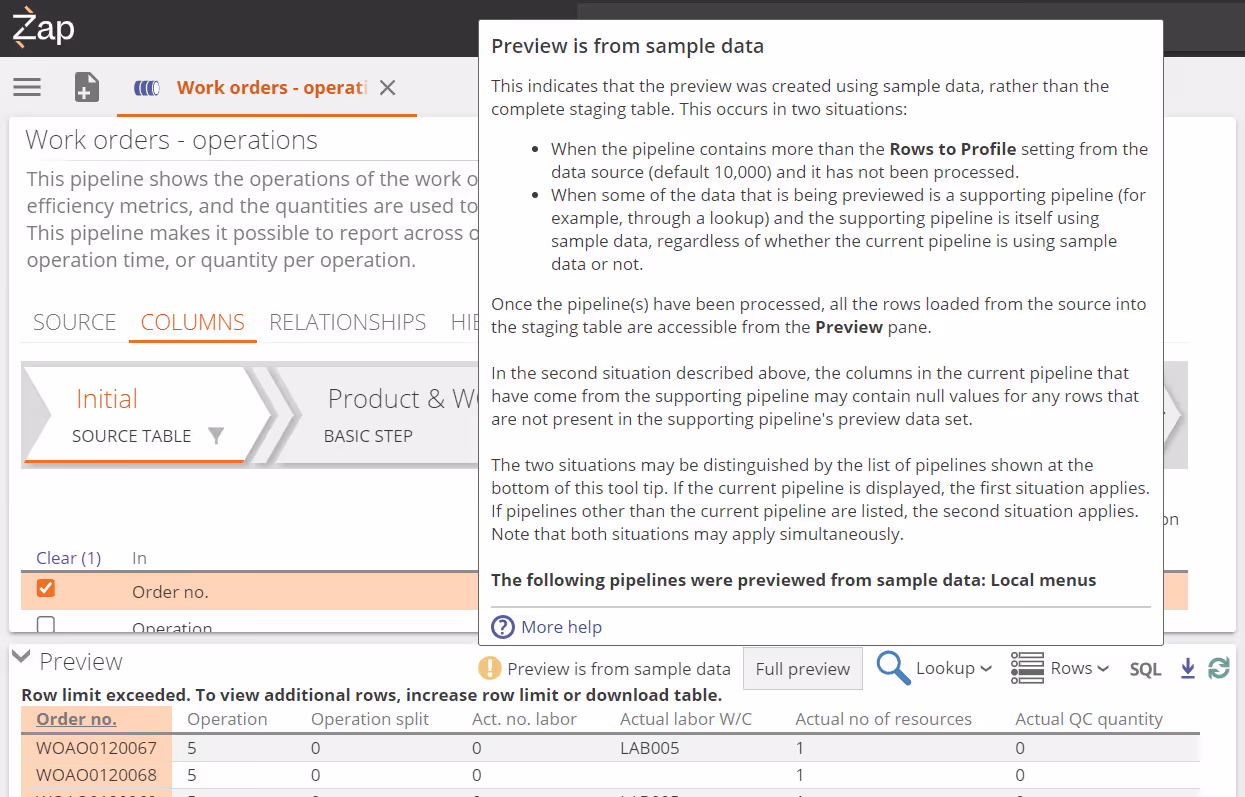 The tooltip that can be seen when hovering over Preview is from sample data will list the pipelines that are being viewed from sample data. In the image below, the Work orders pipeline are being previewed, but Local menus are listed in the tooltip, which means the supporting pipeline Local menus has sample data.