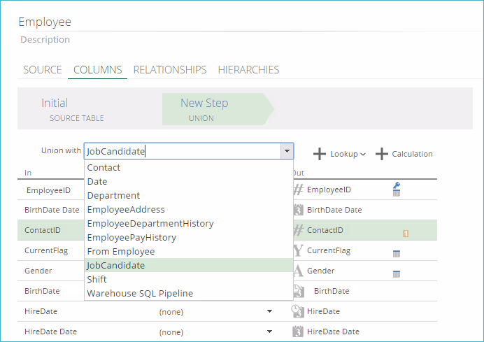 The initial step appears as the first step in all pipelines (default). It lets you choose which columns to load into the data warehouse. Loading only those columns from the data source that are needed will save time when processing the model and reduce the size of the data warehouse database.