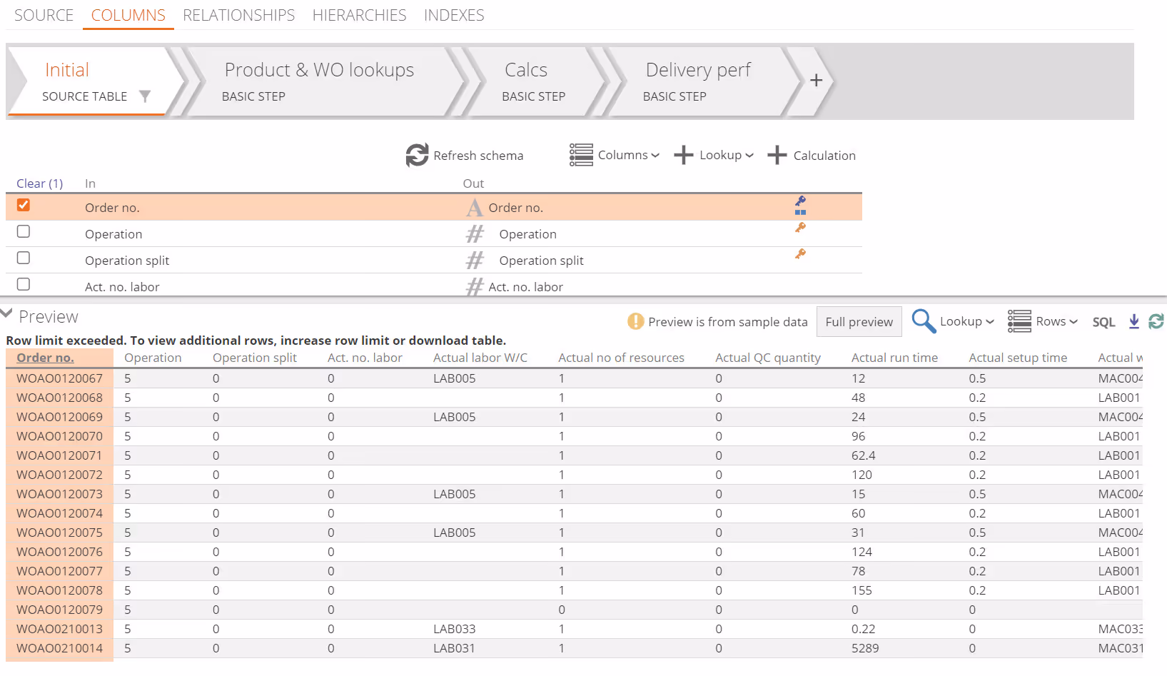 The COLUMNS pipeline tab includes a Preview area that displays the output data of the currently selected step in the pipeline. The default rows to show in the preview is 250. This can be changed up to the profiling limit (default of 10 000), which can be changed on the data source profiling settings section.