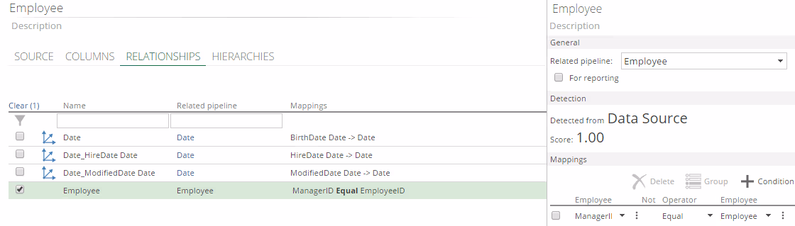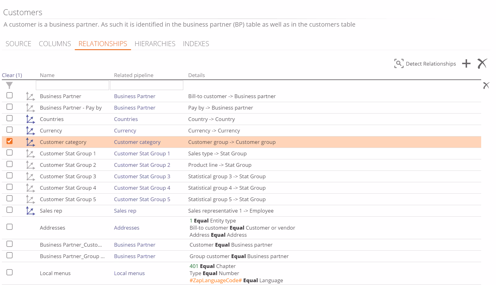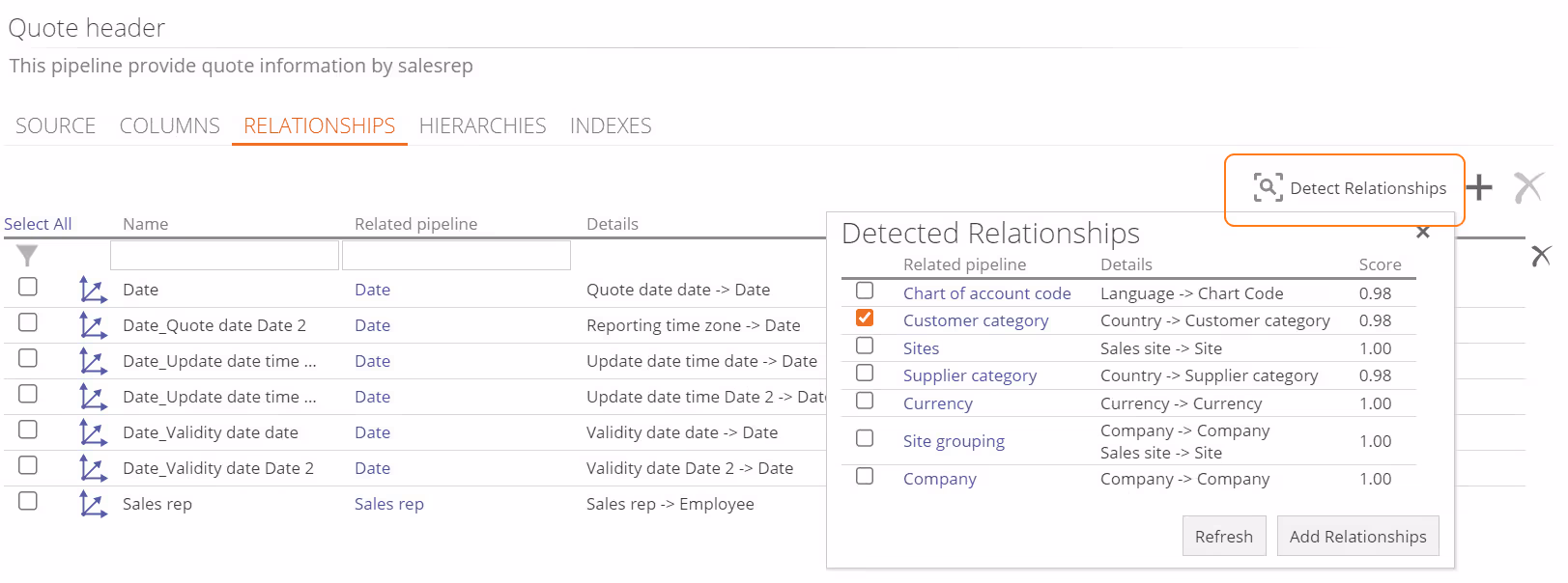 All other relationships can be added manually or by using the Detect feature. When using Detect relationships, Data Hub applies intelligent profiling algorithms to identify and list all logical relationships based on field names and data comparisons. You can then select which relationships to create.