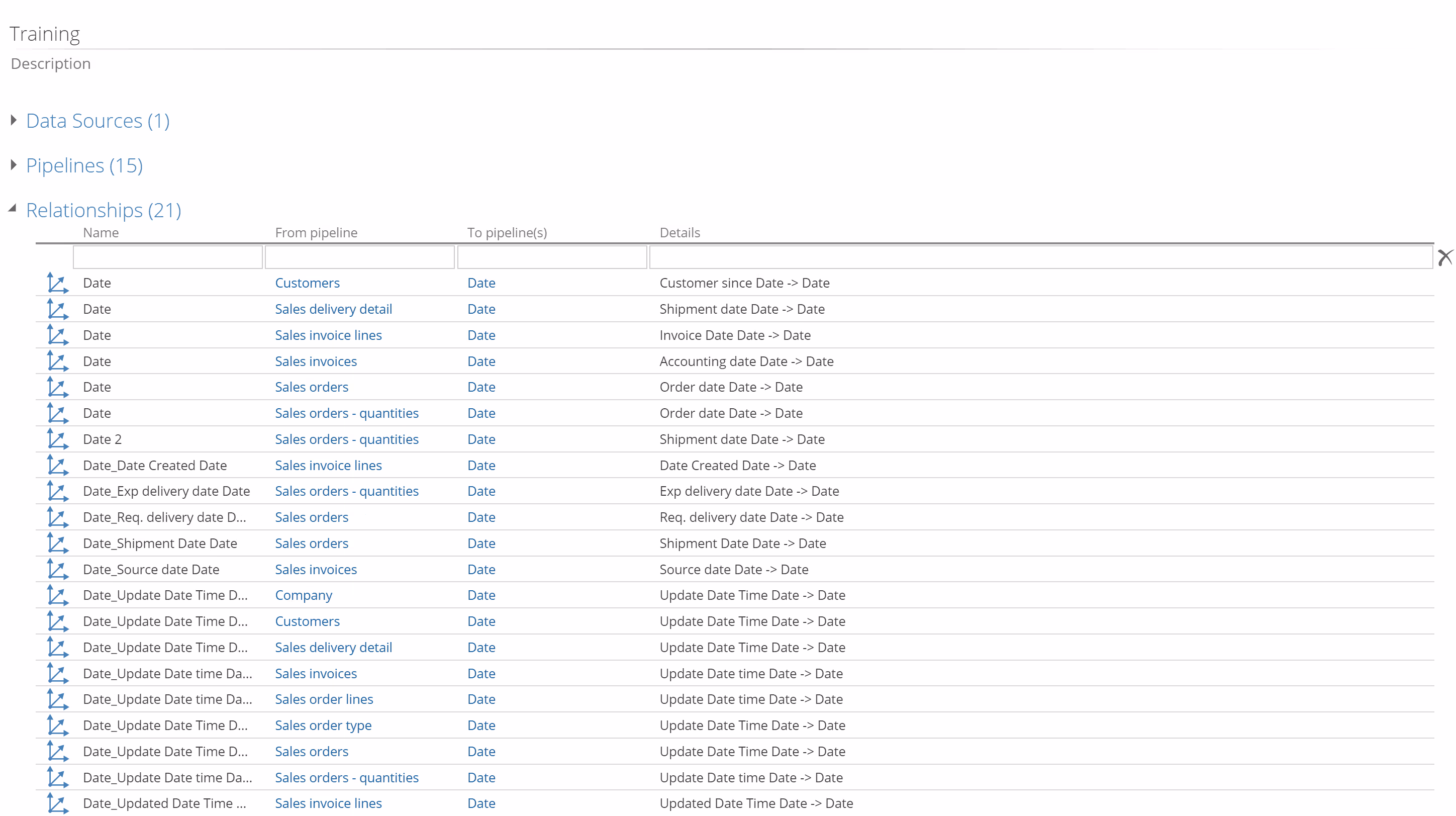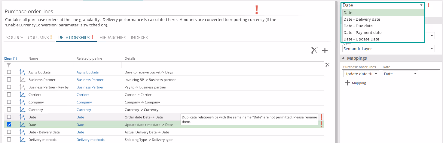 In this example, two relationships from Purchase order line exist to the Date pipeline: one for the Order date, and one for Actual Delivery Date. These are duplicate relationships to the same Pipeline and will act as role-playing dimensions in the cube. A third relationship will be added for Update Date.